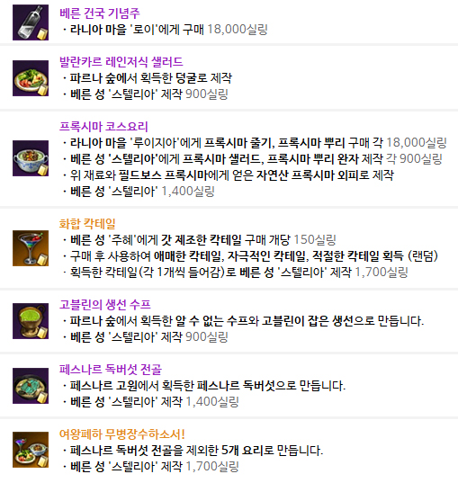 페스나르 독버섯 전골을 제외한 5가지의 요리가 재료입니다.