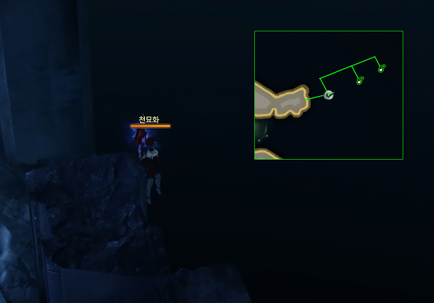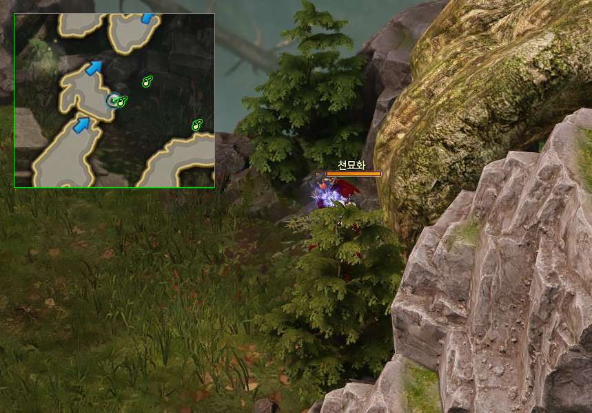오른쪽 나무와 바위 사이로 통과할 수 있습니다.