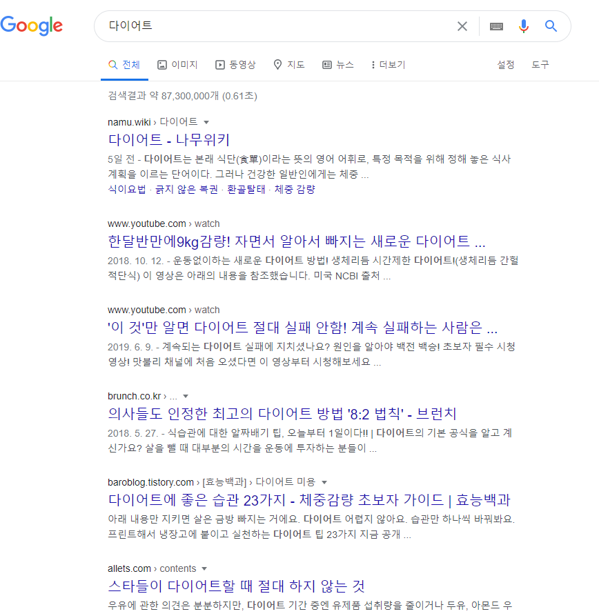 구글에 다이어트라고 검색시에 노출되는 상위에 있는 링크들입니다.