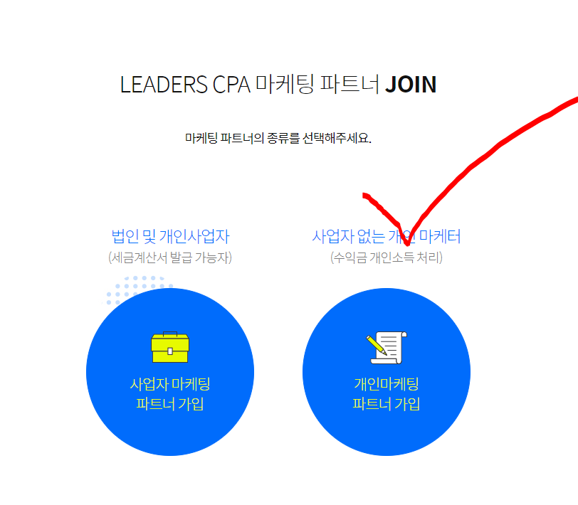 사업자가 아니시라면 보통의 경우 우측의 개인 마케터를 클릭해줍니다.