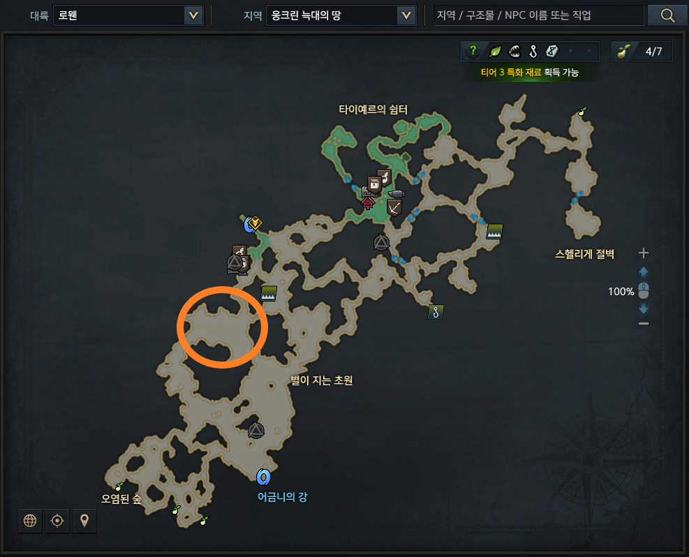 어금니의 강 12시방향 안전지대 & 웅크린 늑대의땅 가운데 스퀘어 홀 바로윗쪽에 나옵니다.(이미지 참조)