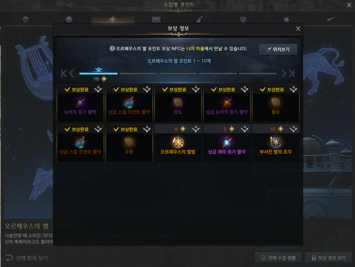 오르페우스의 별 수집 보상
