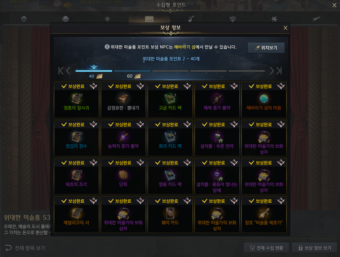 [로스트아크 시즌2]섬마,미술품,모험물등 로아 내실 보상 및 획득처 총정리