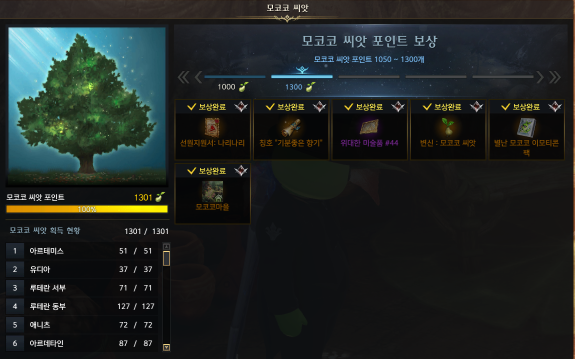 (2022년 4월28일 현재 모코코 씨앗은 1301개까지 획득 가능합니다.)