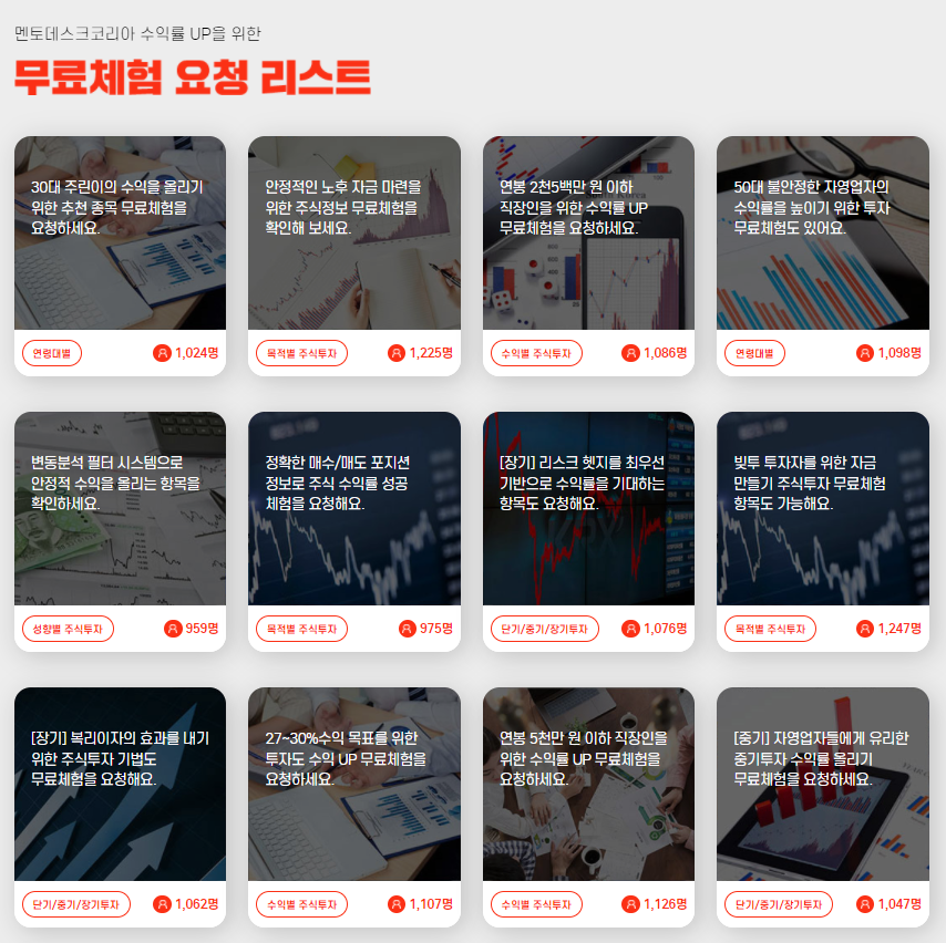 멘토데스크코리아 성공투자를 위한 180여개 항목중 자신에게 적합한 항목을 선택해서 요청할 수 있는 점이 매우