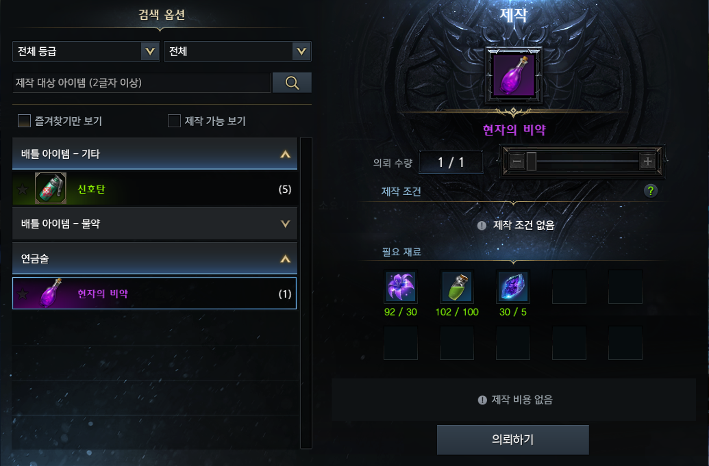 칼리나리 제작지구[12시 방향]의 연금술사 '케미아'에게 [현자의 비약]을 제작(1개)
