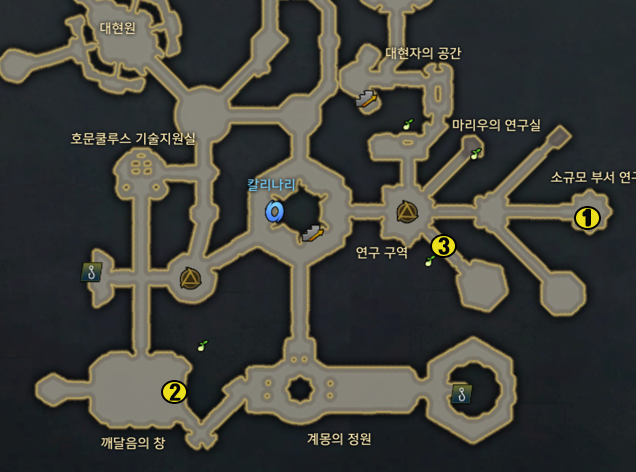 지도 3시지역 소규모 부서연구실의 네임드 '불꽃 호문쿨루스 이그니아'를 처치하고 '뜨거운 온도' 버프 획득 후 7시지역의 그림을 상호작용하면 '화끈한 분노' 버프를 획득하게 된다.해당상태로 (3) 위치로 이동하여 상호작용 후 모코코 수집.