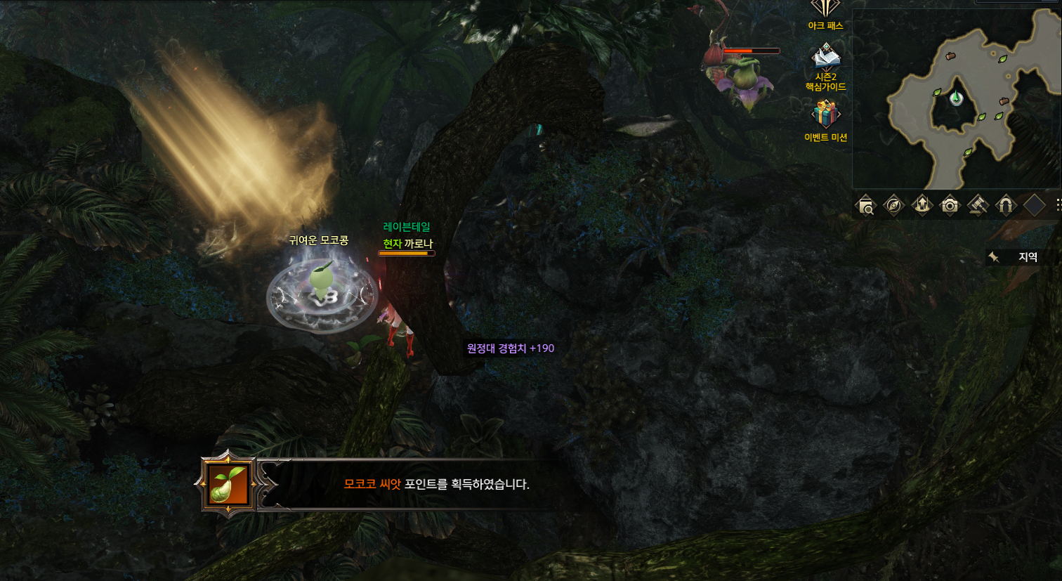 #4,5 주변의 몬스터를 처치한 후 '발화 씨앗'버프가 생기면 해당지역(하단 이미지 참조)에서 입장 후 모코코2개 수집가능