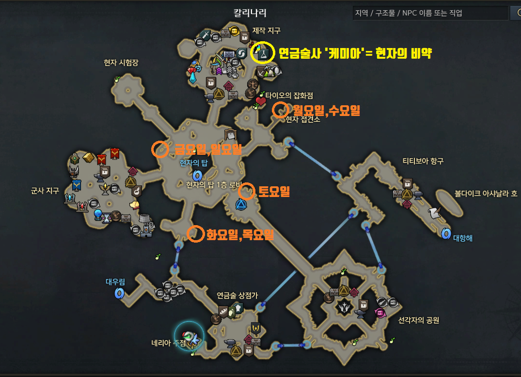 칼리나리 맵에 표시 된 지역에 찾아가서 상호작용 하시면 됩니다.(하단 이미지 참조)